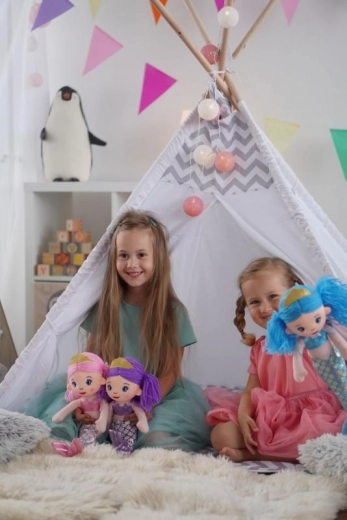Adorable poupée sirène en tissu avec de longs cheveux bleus, une queue scintillante et une couronne jaune, qui ravira chaque enfant. Elle est douce, sûre et idéale pour le jeu créatif et les câlins à la maison comme en voyage. Le format compact de 30 cm tient parfaitement dans les petites mains des enfants.