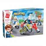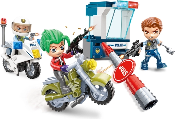 Le set comprend une scène d’action avec une moto de police en poursuite d’un criminel à moto.