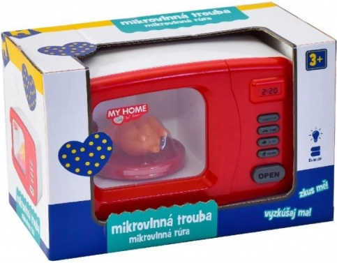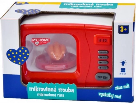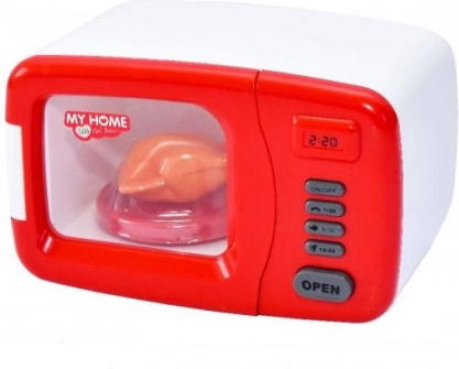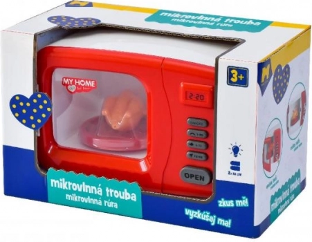 Le four micro-ondes pour enfants a une apparence authentique avec une fenêtre à l'avant et des boutons qui imitent un vrai four micro-ondes.