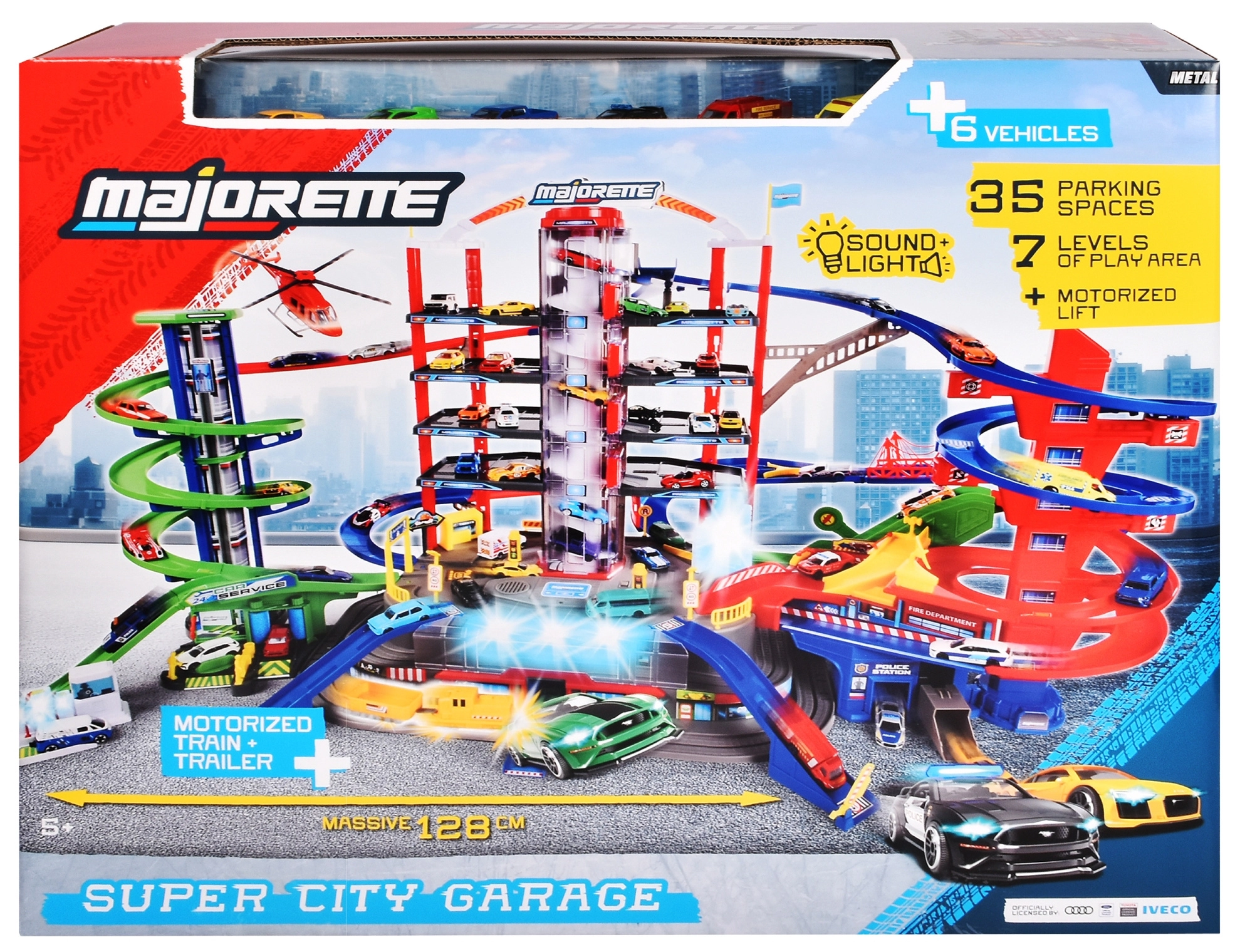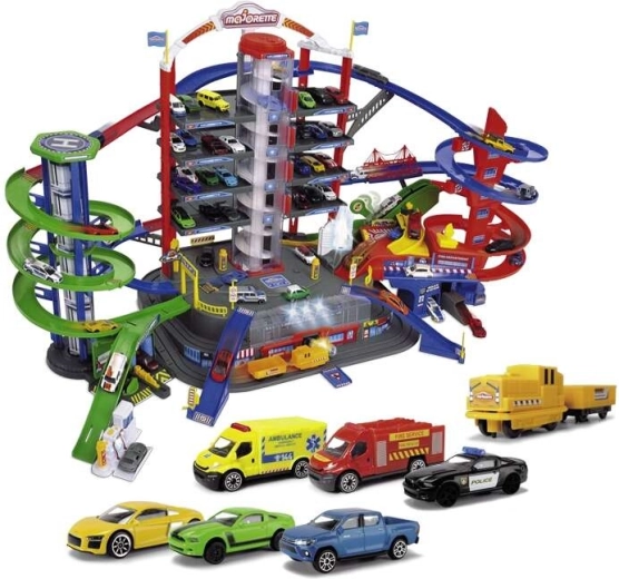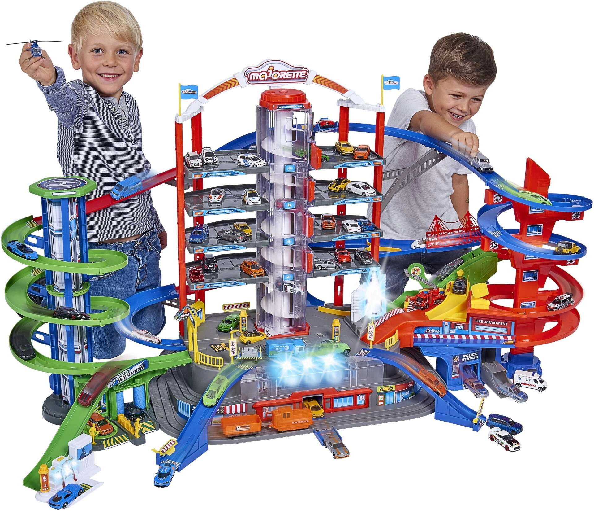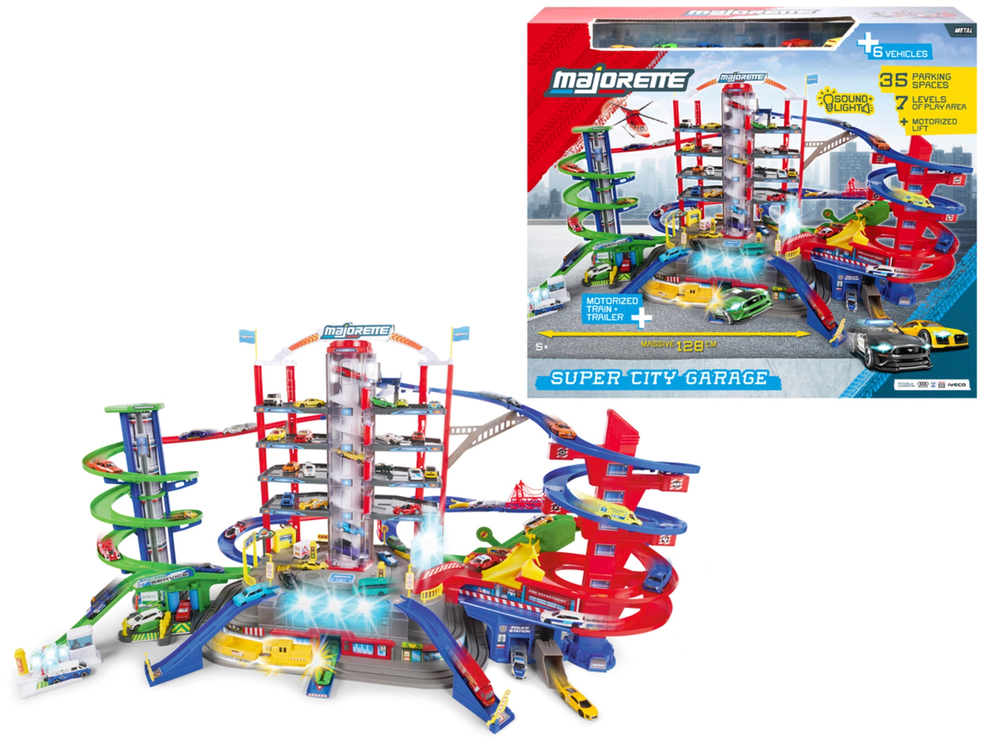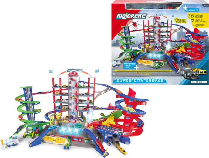 Découvrez le méga set pour petits conducteurs : complexe de garage Super City à 7 étages avec ascenseur, rampes en spirale et 6 petites voitures en métal complétées par une locomotive avec effets lumineux et sonores. Inclus : héliport, poste de police et caserne de pompiers, station de lavage et station-service avec sons et lumières – tout pour un maximum de jeu d’action et de créativité.