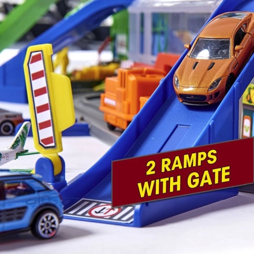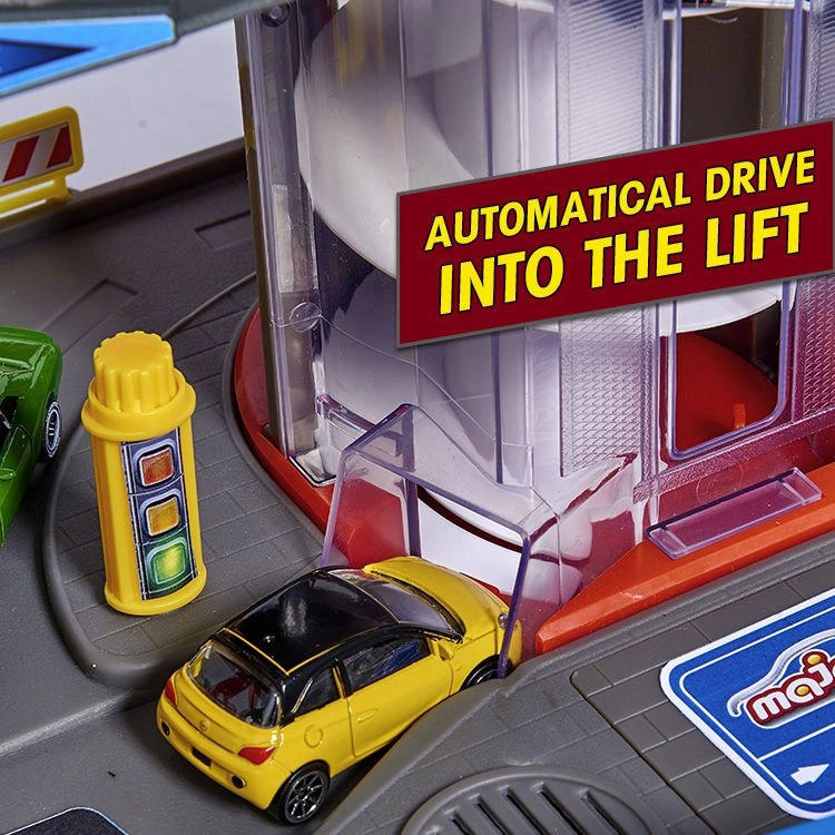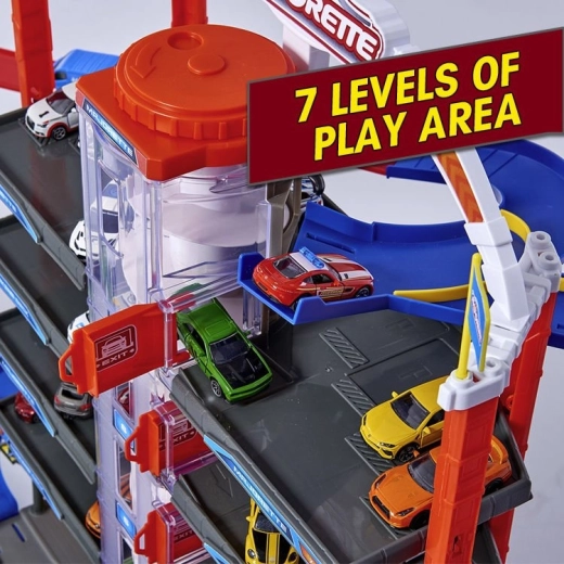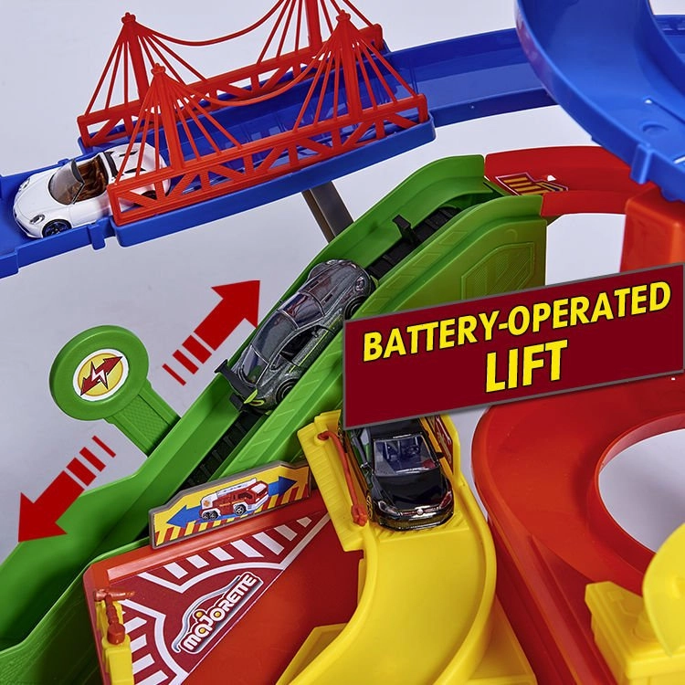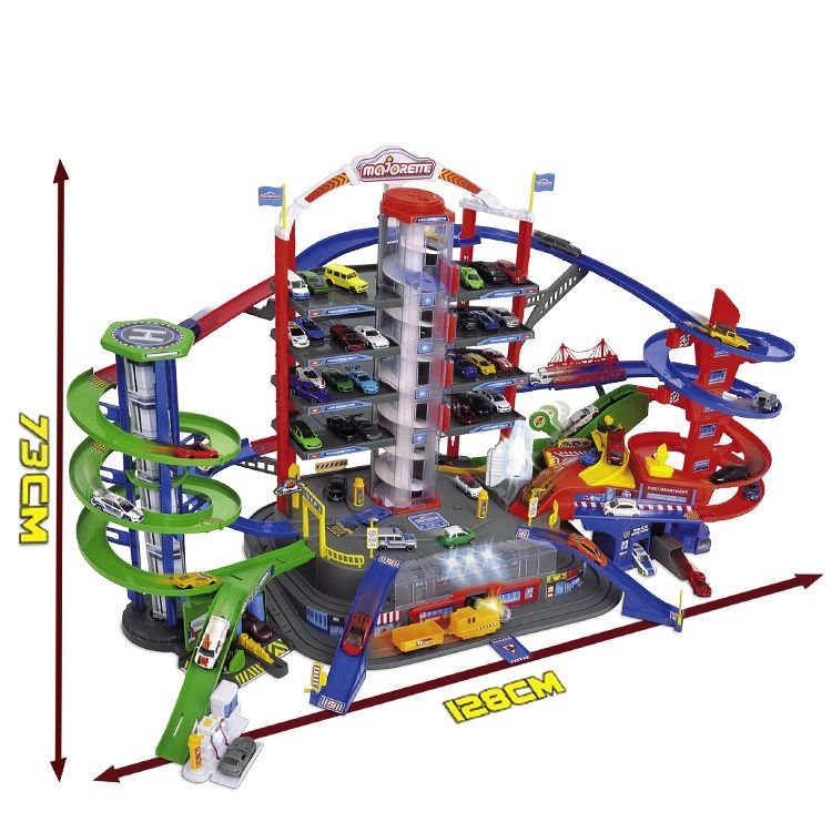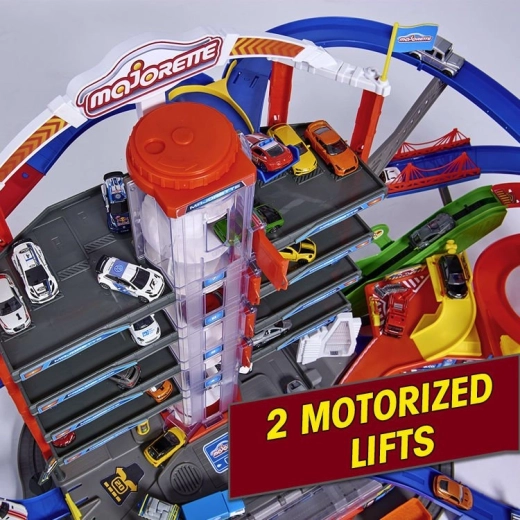 De vastes zones de stationnement, des pistes multi-niveaux et une tour centrale avec ascenseur garantissent de longues heures de divertissement et de courses.