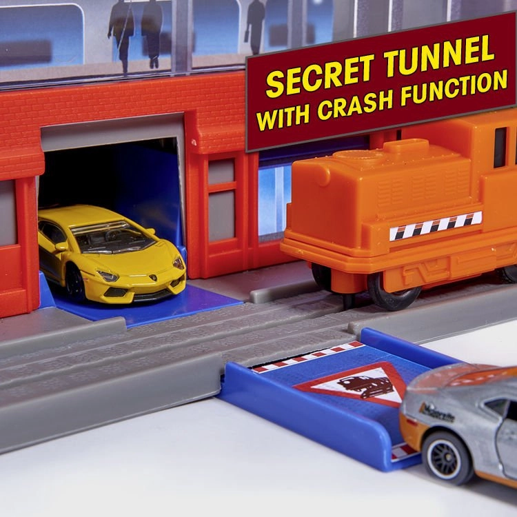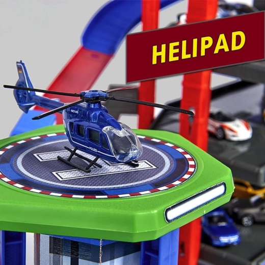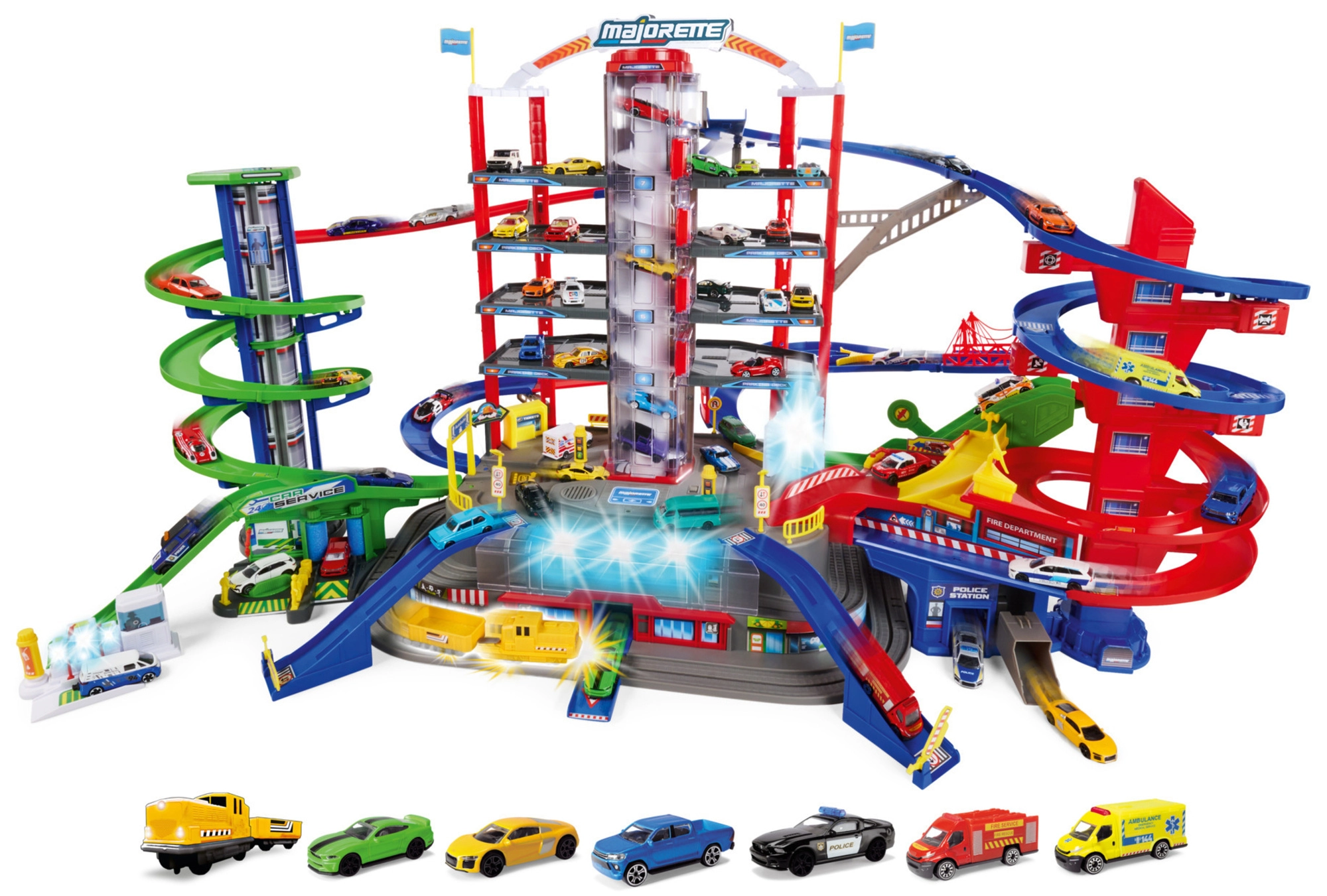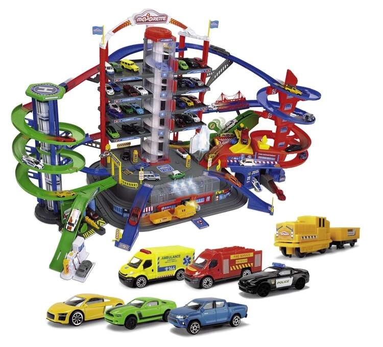 Garage, 6 petites voitures en métal, locomotive avec wagon, ascenseur, rampes, héliport, postes de police et de pompiers, station-service, station de lavage, gare, tunnel secret
