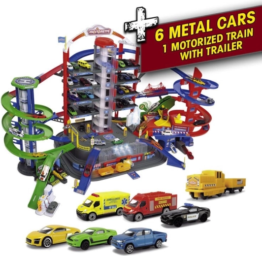 Grand ensemble de garage Super City à 7 niveaux avec 6 petites voitures et une locomotive avec lumières et sons