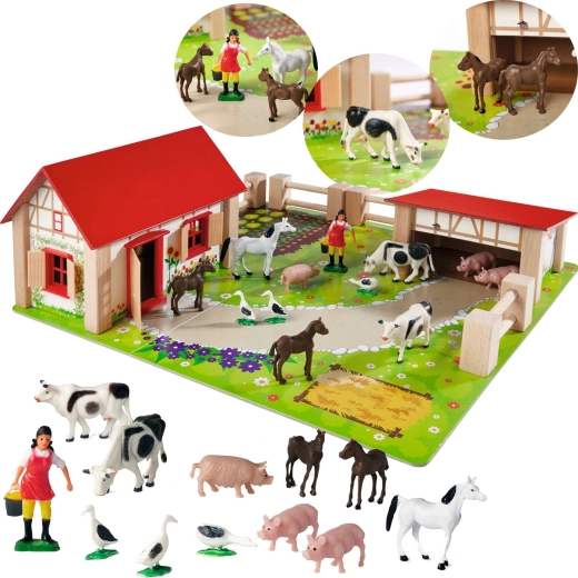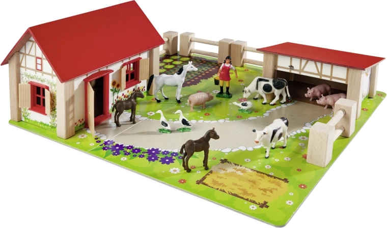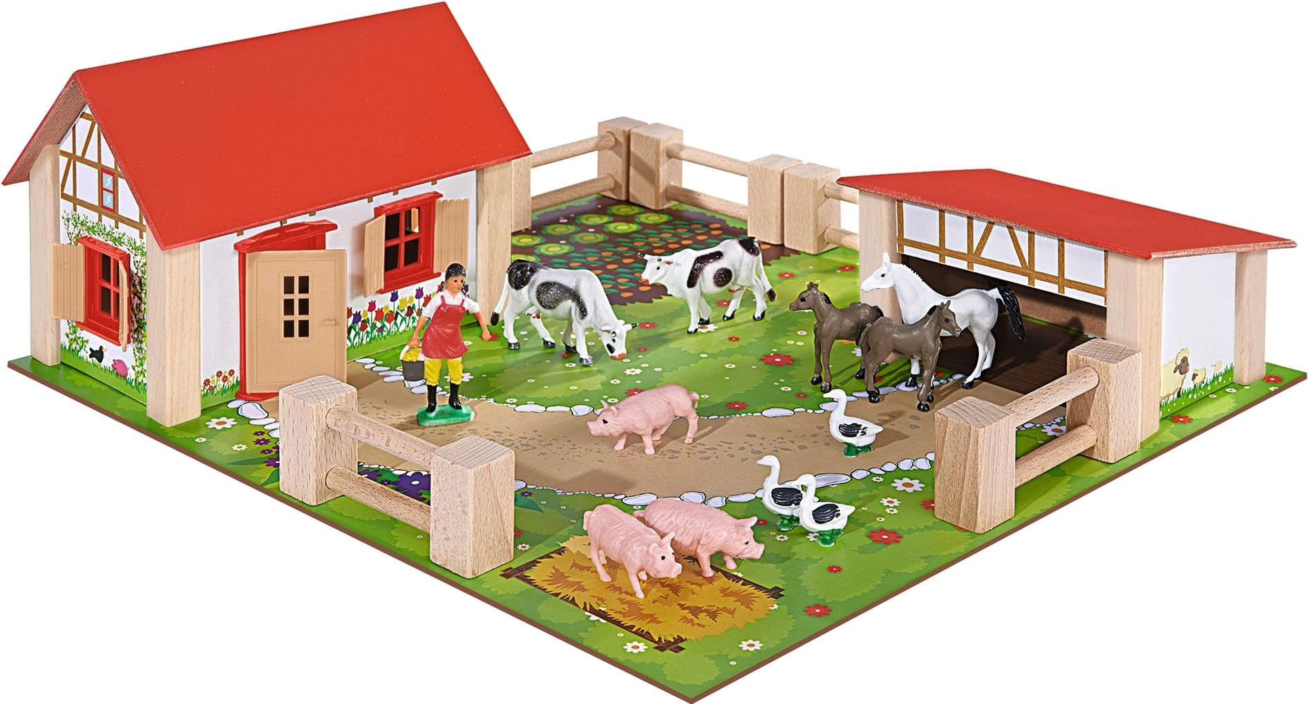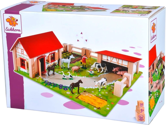 Ferme en bois avec étable et figurines d’animaux, 23 pièces EICHHORN