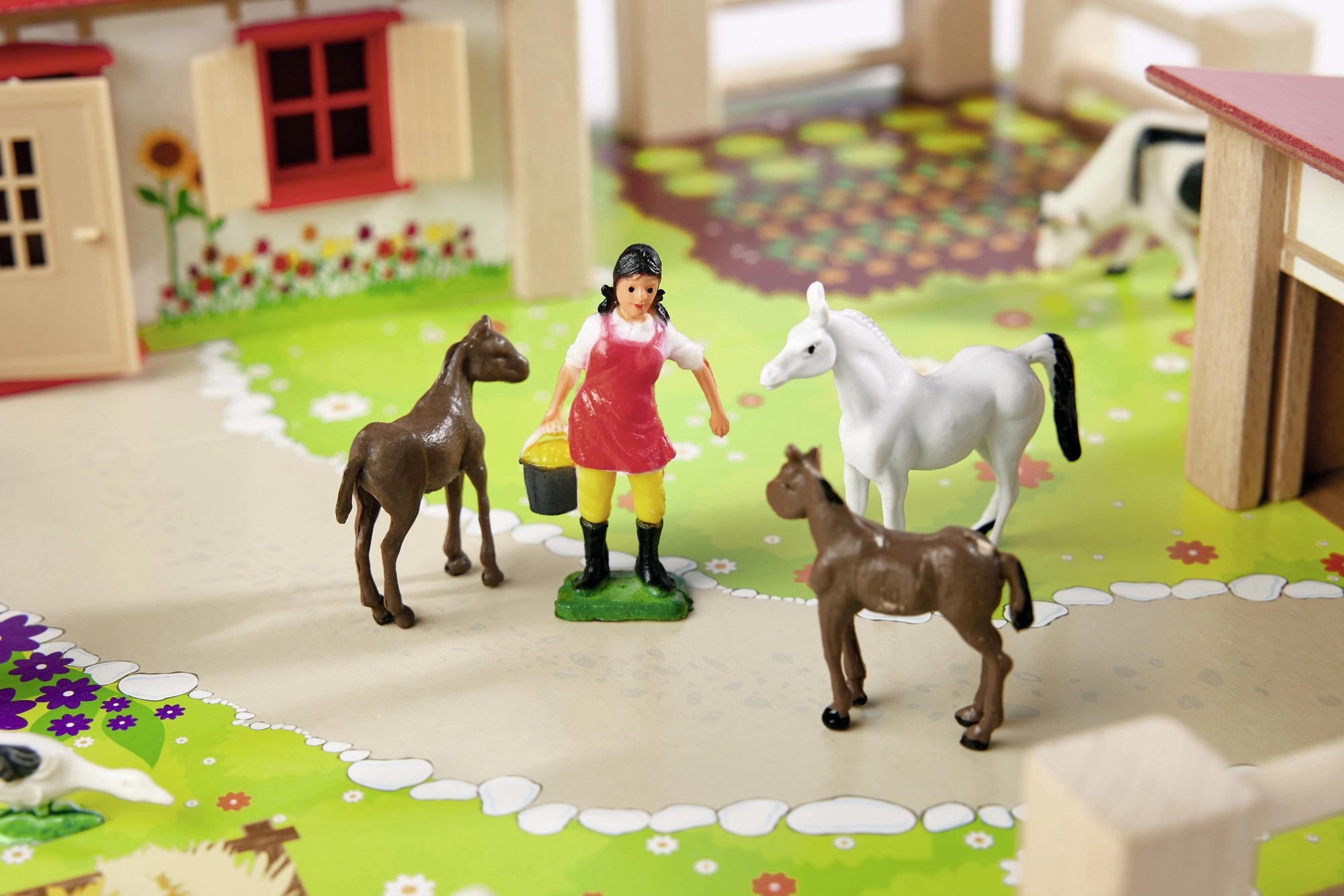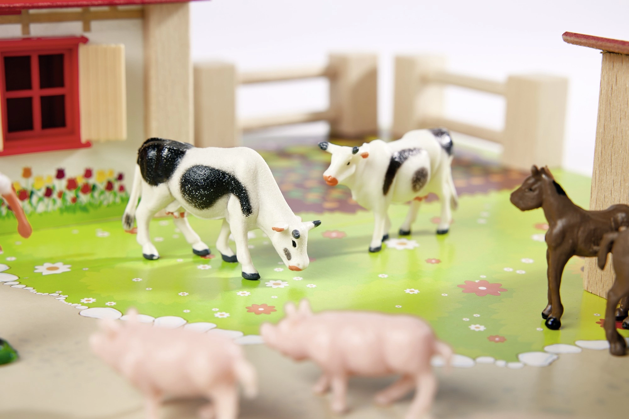 maison, étable, tapis coloré, enclos/clôtures, autocollants, 12 figurines (3 porcelets, 2 vaches, 3 oies, 3 chevaux, une fermière)