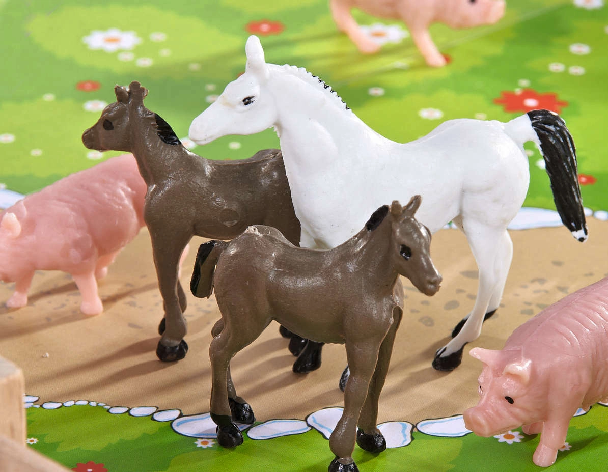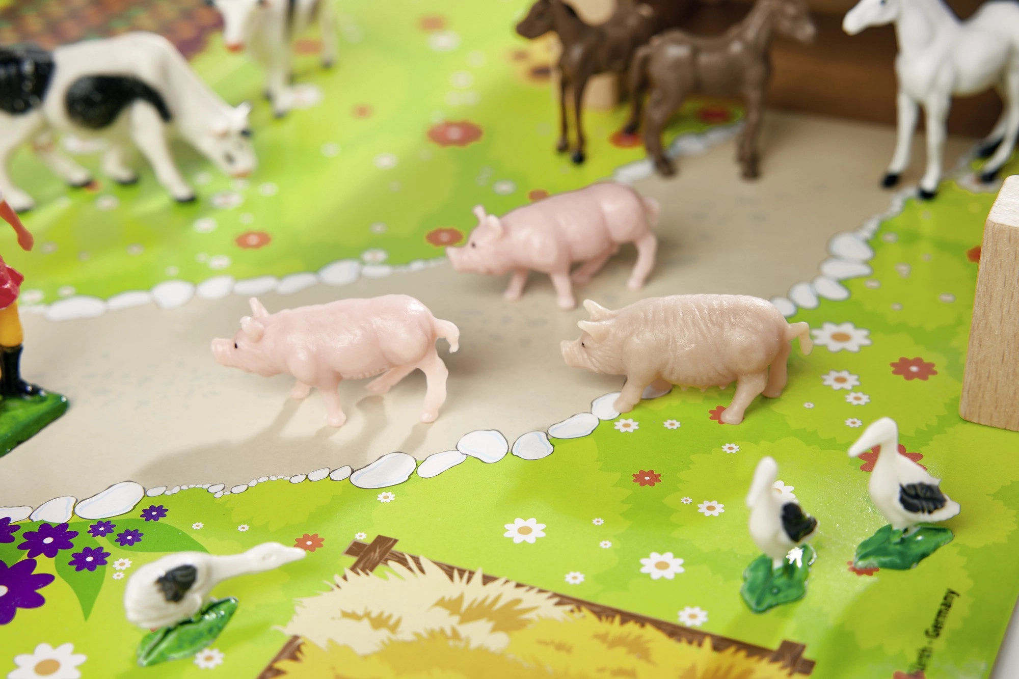 Le tapis avec chemins, pelouse et potager, ainsi que les clôtures connectables, facilitent la construction des enclos et la création de vos propres histoires de ferme.