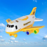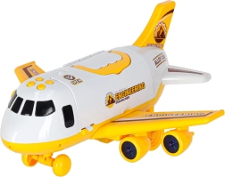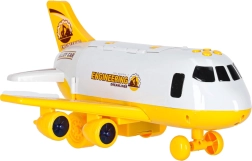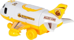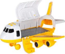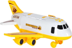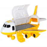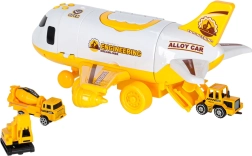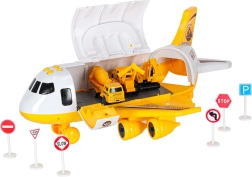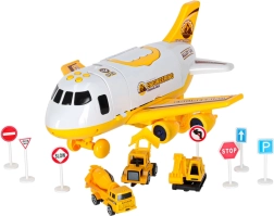 Grand avion de transport pour enfants qui emmène à bord trois engins de chantier et un lot de panneaux de signalisation. Il offre une rampe ouvrante, un accès latéral, effets lumineux LED et sons réalistes commandés par quatre boutons. Grâce à ses ailes amovibles et à sa poignée pratique, il se transporte et se range facilement.