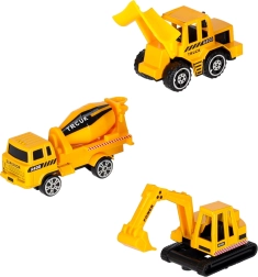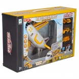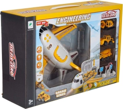 Le set comprend trois véhicules de chantier jaunes – une pelleteuse avec bras mobile, un camion-toupie et un bulldozer – ainsi que 7 panneaux de signalisation. Tout tient à l’intérieur de l’avion. Le jouet dispose d’ailes amovibles pour gagner de la place et d’une poignée pour un transport facile.