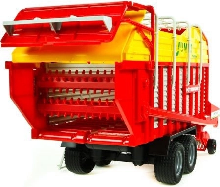 Des fonctions réalistes enrichissent le jeu : une manivelle actionne les rouleaux doseurs, le ramasseur inférieur rotatif et l’éjecteur. La remorque peut être posée seule sur sa béquille et s’attelle à tout tracteur BRUDER des séries 20xx, 21xx et 30xx. La fabrication en plastique de haute qualité garantit une longue durée de vie même en cas d’utilisation quotidienne.