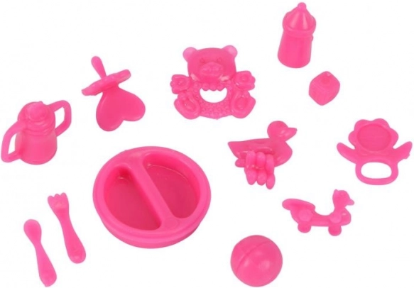 Le set comprend divers jouets en plastique rose comme une assiette, des couverts et une bouteille, enrichissant l'expérience de jeu.