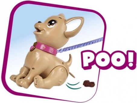 Le chihuahua interactif Poo Poo de CHI CHI LOVE offre aux enfants un jeu à la fois réaliste et sûr autour de l’élevage d’un animal. Prépare une friandise en pâte à modeler, nourris le chien et pars en promenade – après une légère pression sur la laisse, le chien plie les pattes arrière et fait une crotte, que l’on peut facilement ramasser grâce aux sachets fournis.