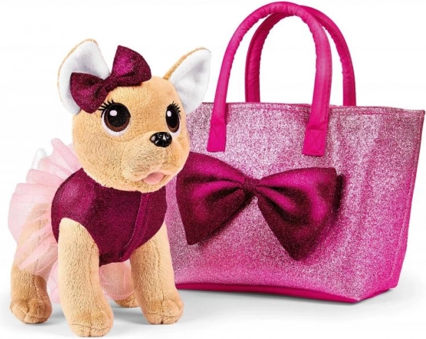 Chien en peluche chihuahua avec un nœud, vêtu d’une tenue rose pailletée, avec un sac assorti orné d’un nœud. Taille 20 cm.