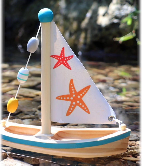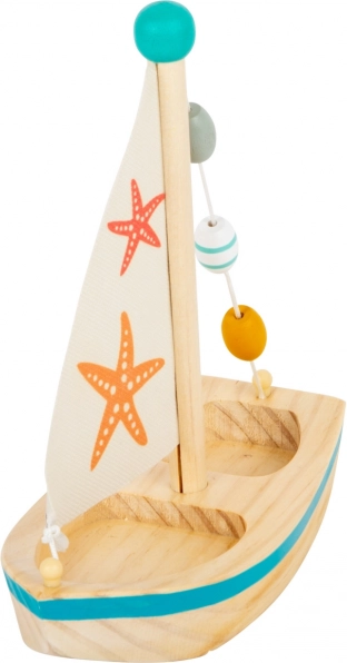 Un voilier en bois au motif d'étoiles de mer est prêt pour des aventures aquatiques dans le bain, à la piscine et à la mer. Il possède une coque flottante, une décoration de perles en bois et suffisamment d'espace pour vos propres figurines. Une excellente alternative écologique aux jouets en plastique, adaptée à partir de 24 mois. Dimensions 17 × 8,5 × 20 cm.