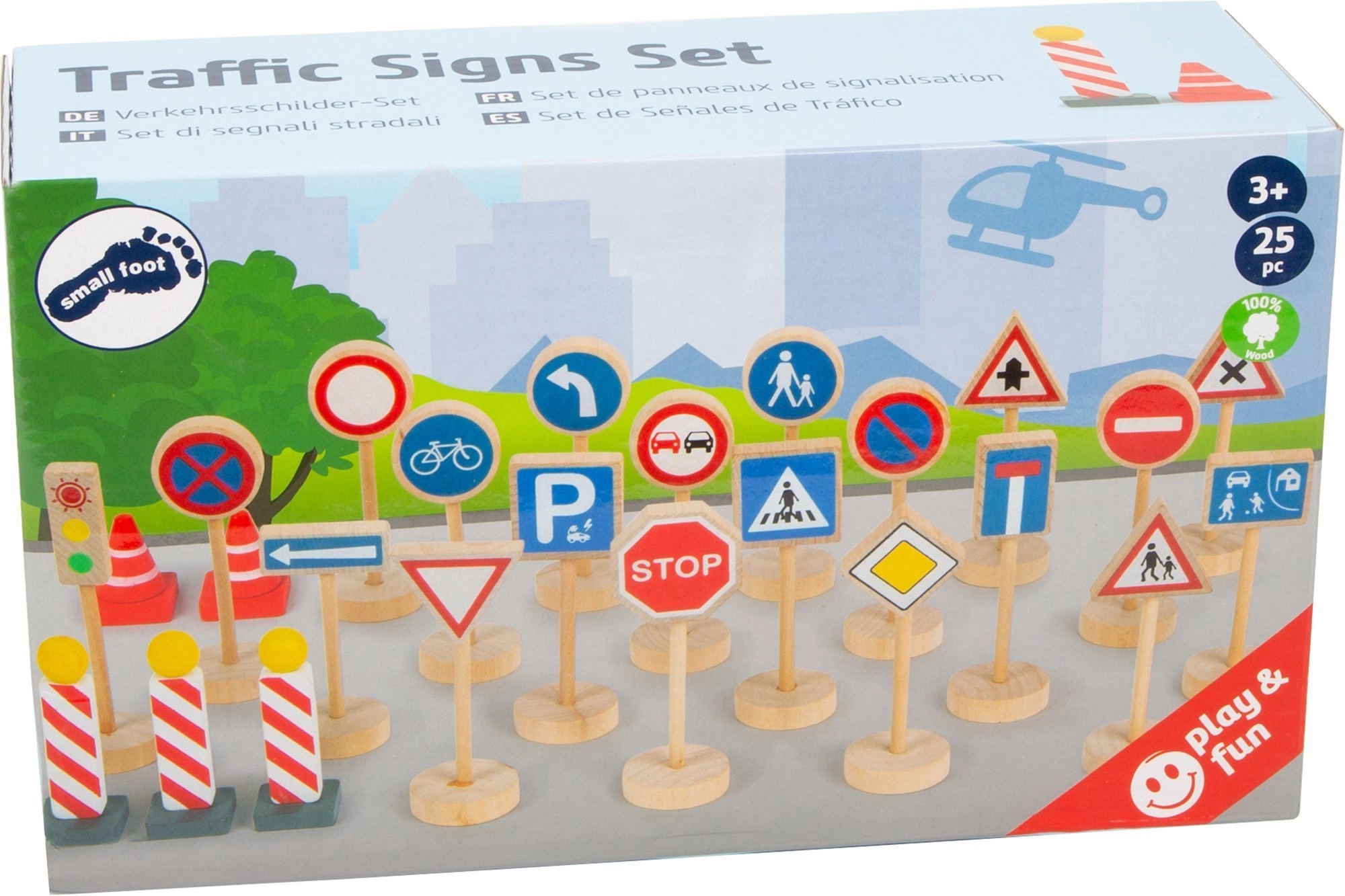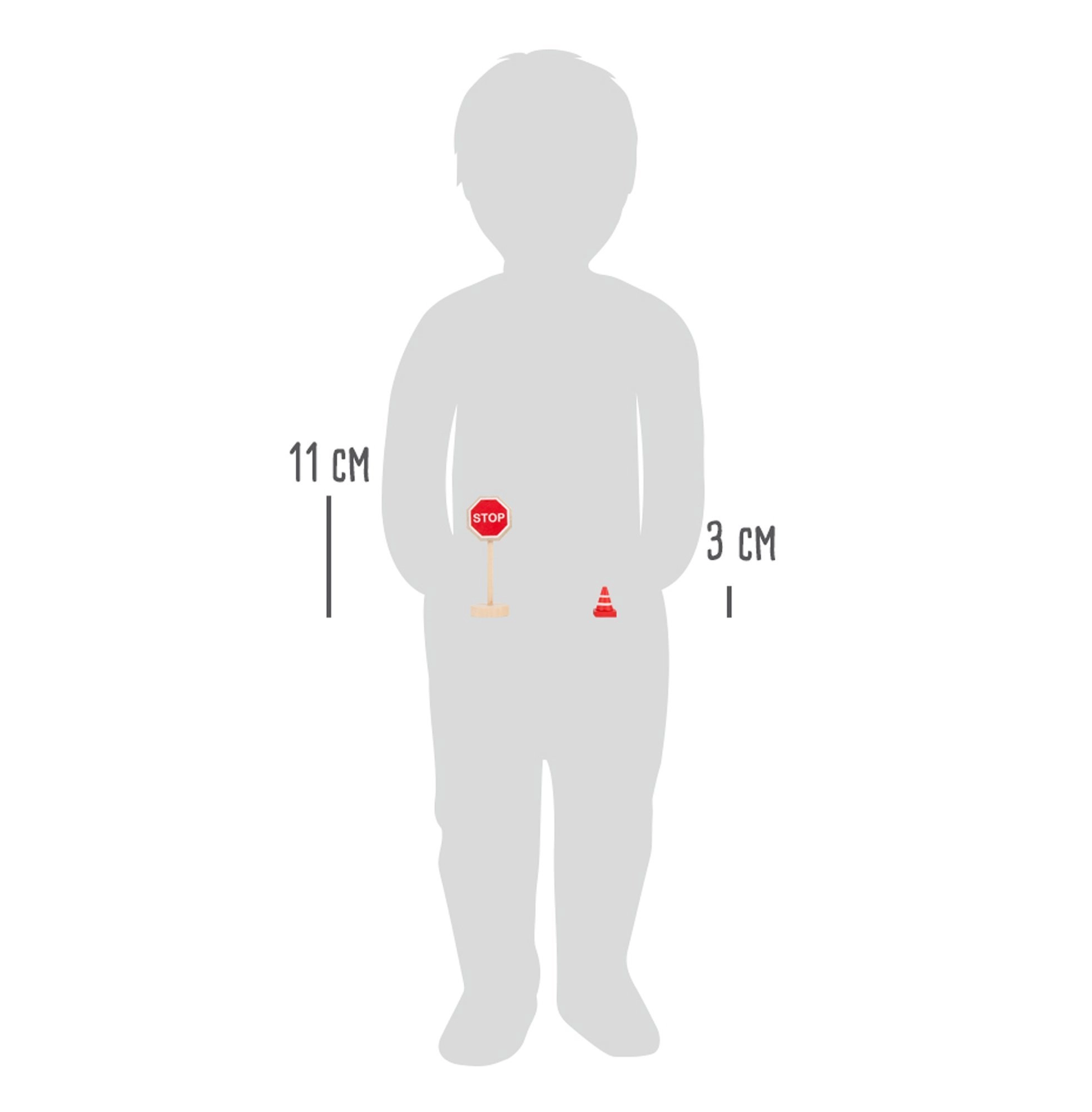 Ce set en bois de qualité apporte tout ce dont les enfants ont besoin pour créer leur propre univers routier. Il contient des panneaux tels que STOP, direction obligatoire à gauche, interdiction de dépasser, route prioritaire, passage piéton, parking, ainsi qu’un feu tricolore, des cônes et des barrières. Les pièces mesurent environ 3 à 11 cm de hauteur, tiennent bien en main et restent bien stables grâce à leurs bases solides.