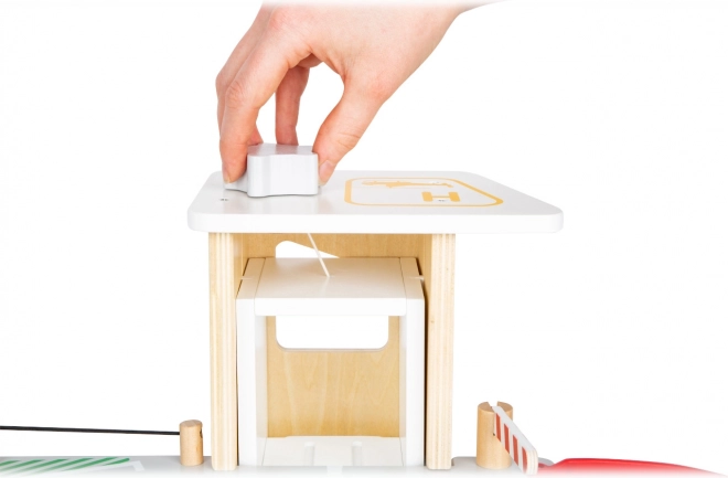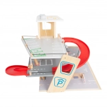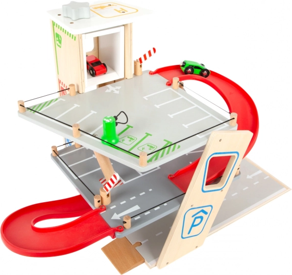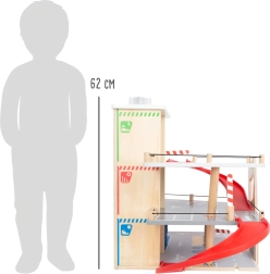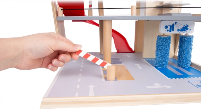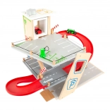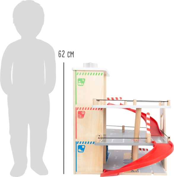 Découvrez un parking en bois robuste sur trois niveaux, avec un ascenseur fonctionnel et des rampes fluides pour des jeux de voitures sans fin. Inclus: deux voitures, une station-service, une borne de recharge pour véhicules électriques, une rampe élévatrice, un lave-auto avec brosses et des barrières mécaniques à chaque étage. La barrière en caoutchouc assure une conduite sûre et le marquage détaillé développe la connaissance du code de la route.
