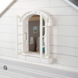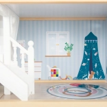La maison de poupées a une façade extérieure lumineuse, un design moderne et des éléments fonctionnels comme des portes coulissantes et des fenêtres ouvrables.