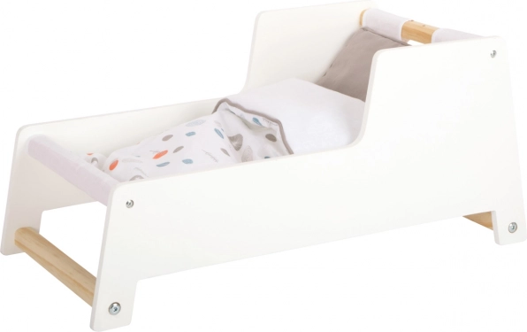 Berceau pour poupées au style nordique, pour enfants dès 3 ans. Il offre une structure en bois stable, des patins à bascule, un baldaquin facilement amovible et une parure de lit réversible et neutre. Sous la grande couette, les poupées et peluches jusqu’à 46 cm dorment confortablement. Les tons pastel élégants et les bords arrondis s’intègrent parfaitement dans une chambre d’enfant moderne.