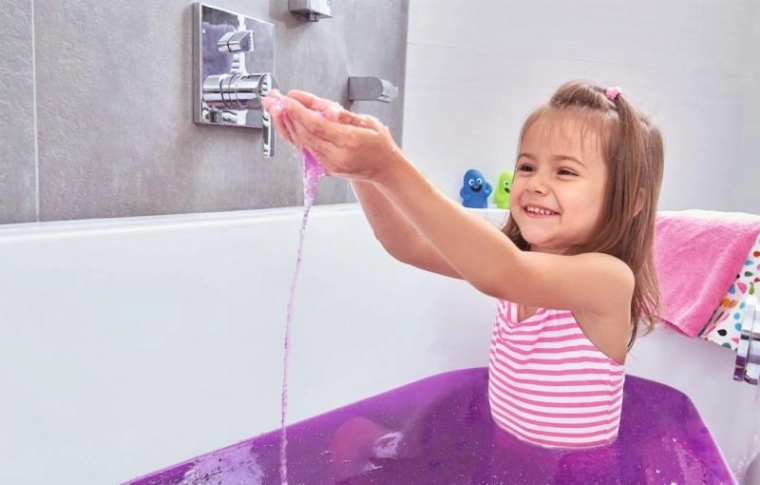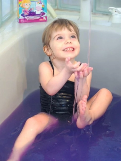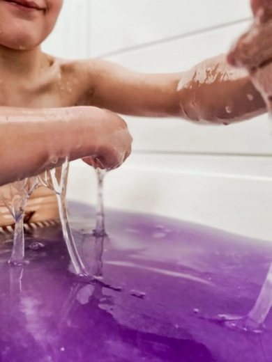 Glibbi transforme le bain en slime violet pailleté, offrant aux enfants une sensation totalement nouvelle du bain quotidien.