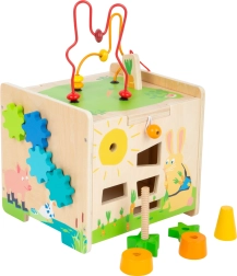 Ce cube d’activités en bois de qualité, illustré de lapins et de leurs amis, encourage l’exploration, entraîne la coordination œil–main et soutient les premiers apprentissages musicaux grâce au xylophone intégré. La partie supérieure avec labyrinthe de perles se retire et se retourne facilement pour un gain de place, et peut même servir de petit siège.