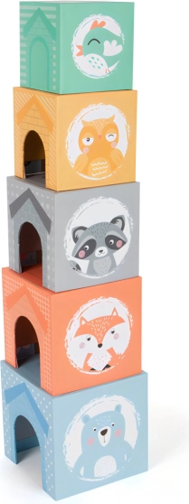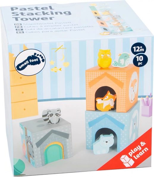 La tour empilable « Pastel » combine des cubes solides en carton avec des animaux en bois dans un design pastel moderne. Chaque face des cubes propose un indice pour l’ordre correct, permettant aux enfants d’apprendre, en jouant, le tri et la perception de l’espace. Grâce aux petites fenêtres et portes, les animaux peuvent « habiter » à l’intérieur, ce qui stimule l’imagination et le jeu de rôle.