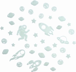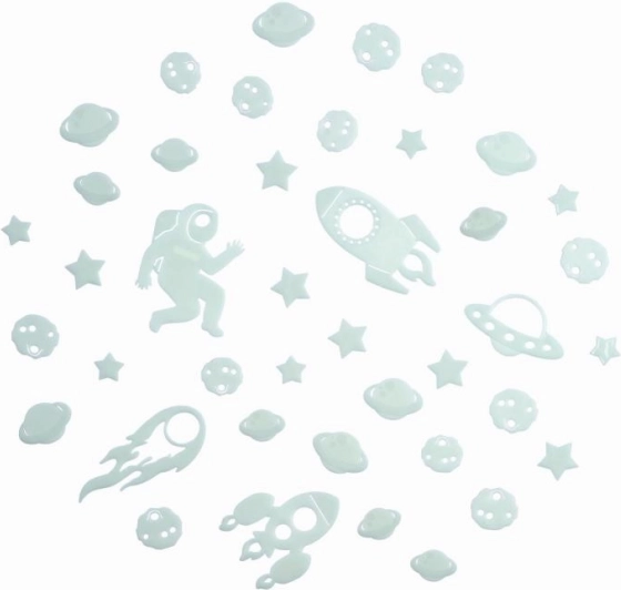 Avec cet ensemble spatial, vous créez facilement un ciel nocturne féerique directement dans la chambre des enfants. Il suffit d’exposer les décorations à la lumière et leur effet phosphorescent assure une douce lueur qui stimule l’imagination et favorise un endormissement paisible.