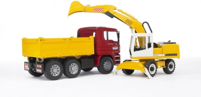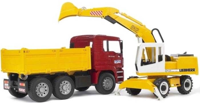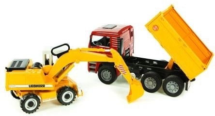 Ce formidable coffret de construction de la marque Bruder comprend un camion MAN TGA avec pneus souples et une benne basculante pratique. Il est livré avec une pelle Liebherr fonctionnelle, dotée de béquilles de stabilisation, de pneus profilés et d’un godet avec cabine rotative à 360°. Le produit est fabriqué en Allemagne avec des matériaux résistants.