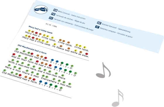 Le pack inclut une baguette et des partitions codées par couleurs avec huit morceaux connus, tels que « Old MacDonald avait une ferme », « Vive le vent » ou « Brille, petite étoile ». Jouer des cloches développe l’écoute musicale, la motricité et favorise la concentration – parfait pour jouer à la maison comme pour une utilisation en maternelles et à l’école primaire.