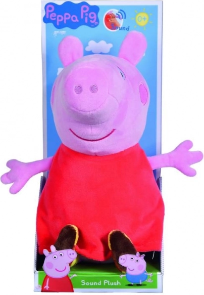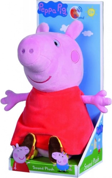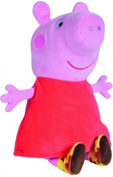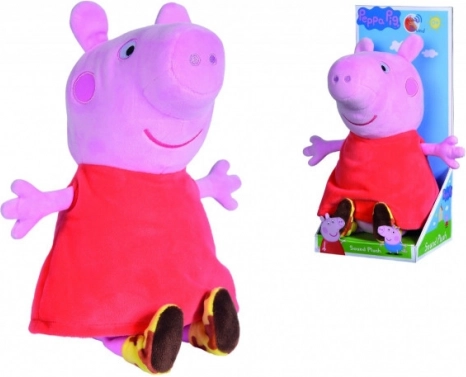 Adorable peluche Peppa en robe rouge qui ravira chaque enfant. En appuyant sur son ventre, elle émet de joyeux sons. Toute douce et moelleuse, idéale pour câliner et jouer. Sa hauteur compacte de 22 cm tient parfaitement dans les petites mains des enfants.