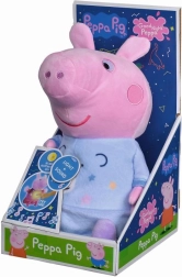 Matière ultra douce, pyjama bleu à motifs d’étoiles et expression amicale de Peppa invitent aux câlins et au jeu.