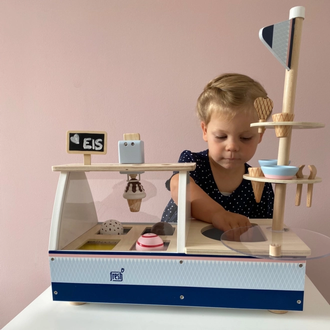 Le set comprend huit parfums de glace différents, dont vanille, chocolat, stracciatella et fraise. Des éléments interactifs, tels que des supports pour cornets, une vitrine en plastique et un congélateur avec couvercle transparent, intensifient encore l’expérience de jeu.