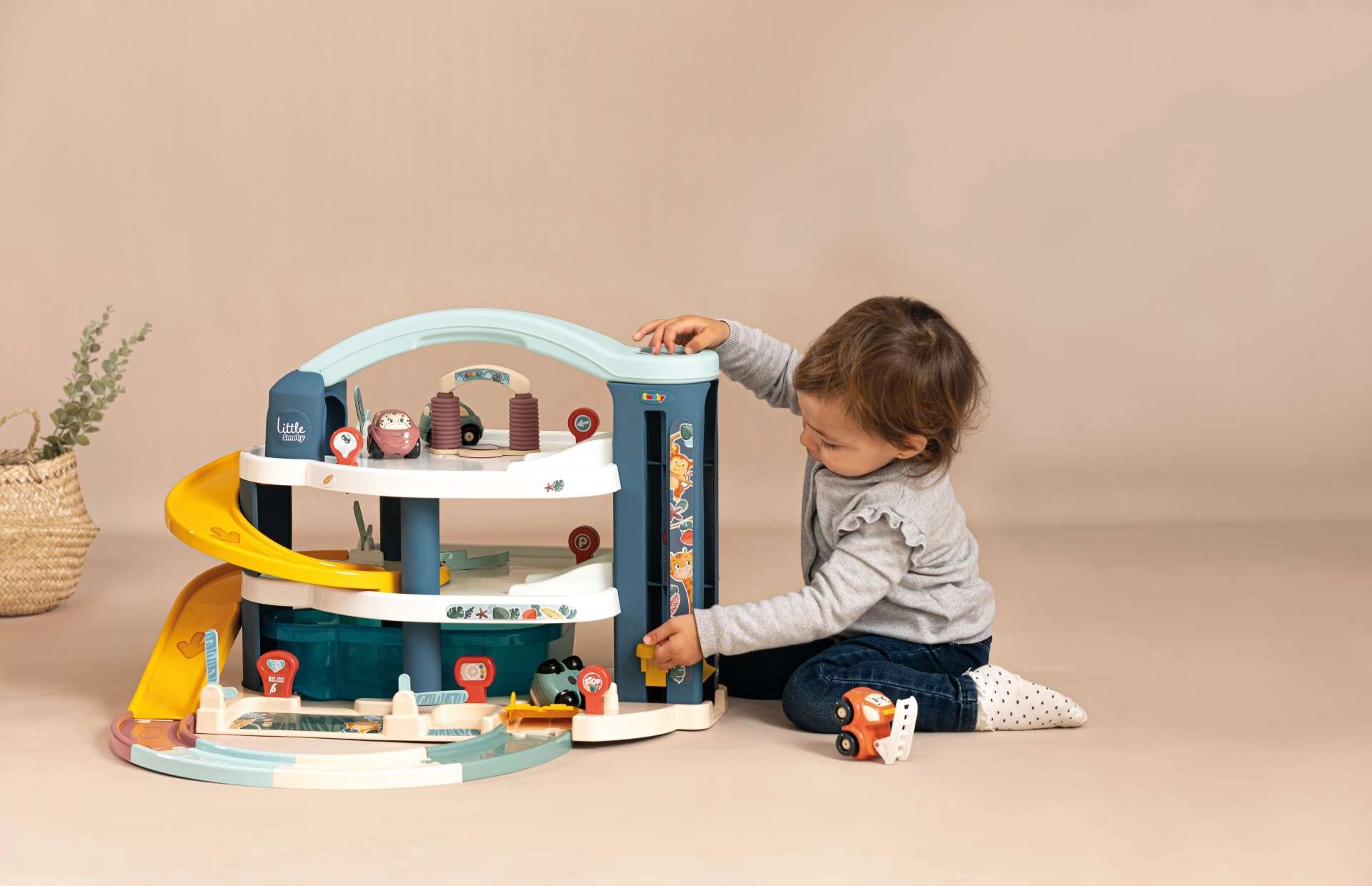 Découvrez le garage Little Smoby à trois étages robuste avec méga rampe, ascenseur fonctionnel, lave-auto, station-service et héliport. Le coffret comprend une petite voiture et un hélicoptère. Grâce à la poignée pratique, le garage se transporte facilement et dispose d’un espace de rangement caché pour les petites voitures. Cadeau idéal pour les enfants à partir de 18 mois, fabriqué en France.