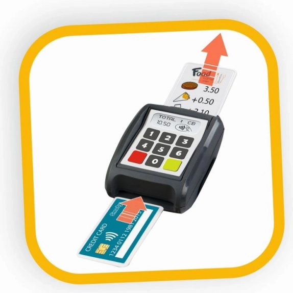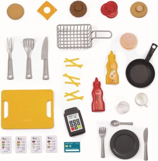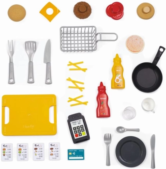 Le set séduit par une multitude de détails : plaque de cuisson, friteuse, évier avec robinet, four, réfrigérateur, distributeur de boissons, machine à café et crochets de suspension pour les ustensiles. Sont également inclus un terminal de paiement, des reçus, une carte bancaire et un menu imprimé. Après le jeu, les restes peuvent être « rangés » dans la poubelle. Au total, 29 accessoires encouragent des scénarios de jeu de rôles riches et la motricité fine.