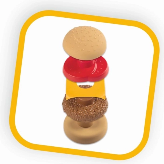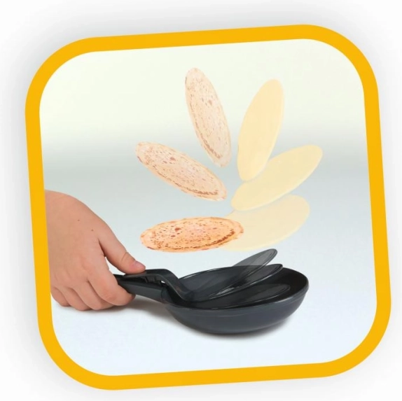 De la poêle et des ustensiles au burger, frites, sauces et carte bancaire. La crêpe change de couleur lorsqu’on la retourne dans la poêle pour encore plus d’amusement.