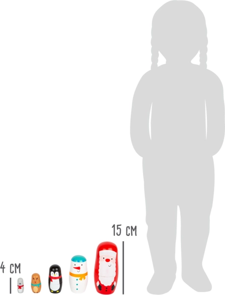 Adorable ensemble de matriochkas en bois aux motifs Père Noël, bonhomme de neige, manchot, renne et ours qui apporte une ambiance de Noël à la maison. Les enfants s’amuseront avec le jeu d’emboîtement et d’assemblage, qui développe la motricité fine et la coordination main–œil. Idéal comme décoration de Noël et comme cadeau pour les enfants dès 3 ans.