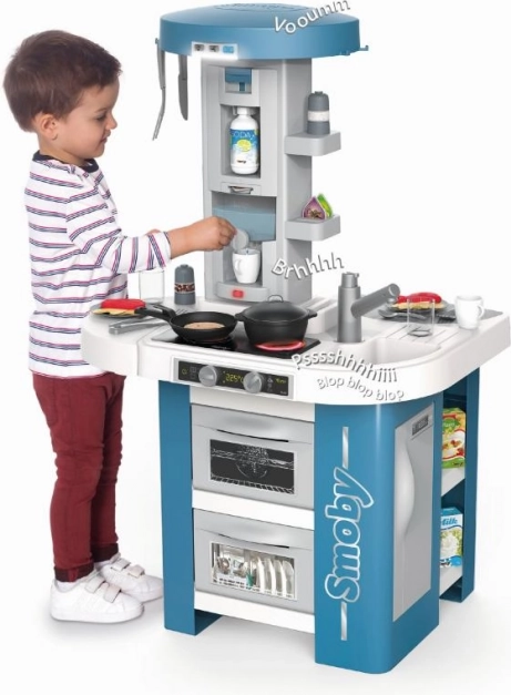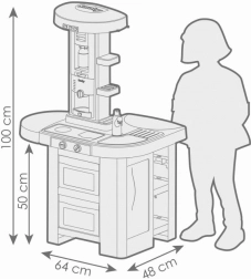 Les autres équipements incluent un four, un lave-vaisselle, un réfrigérateur, un évier avec eau courante, un distributeur de soda et de nombreux espaces de rangement. Comprend 35 accessoires amusants dont des ustensiles de cuisine qui complètent l'expérience authentique du jeu de cuisine.