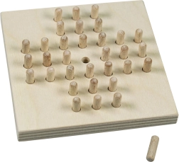 Le solitaire en bois Detoa offre un divertissement astucieux dans un format compact. La partie commence par le retrait de la cheville centrale, puis se poursuit en sautant par-dessus les chevilles adjacentes horizontalement ou verticalement. Chaque cheville sautée est retirée du plateau – planifiez vos coups à l’avance et essayez de n’en laisser qu’une à la fin.