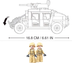 Modèle de Hummer aux détails soignés, arme pivotante et pneus robustes pour des scènes de terrain authentiques.