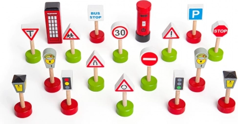 L’ensemble de panneaux de signalisation en bois BIGJIGS RAIL est l’accessoire idéal pour les circuits de trains et autres constructions en bois. Des symboles clairement illustrés (STOP, vitesse, avertissement, etc.) initient les enfants aux bases de l’éducation routière de manière amusante. La conception robuste en bois naturel assure une longue durée de vie même lors d’un usage quotidien.