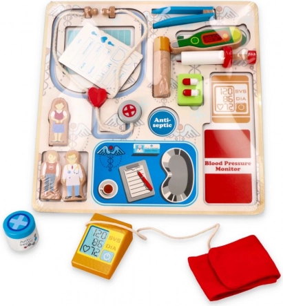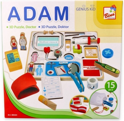 Puzzle en bois à encastrer Bino sur le thème médical. Développe la motricité fine, la logique et la coordination. Peintures sûres, planche solide. Pour enfants dès 3 ans.