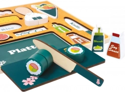 L'ensemble comprend des composants en bois comme des sushis, des sauces, des ustensiles et un couteau pour "couper", permettant un jeu réaliste et créatif. Ce jeu convient aux enfants de plus de 36 mois, mais il est recommandé qu'un adulte surveille les enfants de moins de 3 ans.