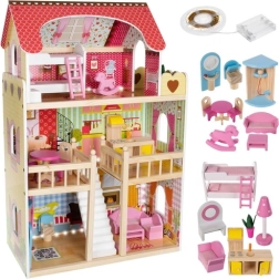 La maison comprend un éclairage LED qui peut être placé selon les souhaits de l'enfant, renforçant ainsi la magie du monde imaginaire. Elle est divisée en trois niveaux connectés par de jolis escaliers blancs et propose cinq pièces et un balcon, offrant suffisamment d'espace pour une famille de poupées de quatre personnes.