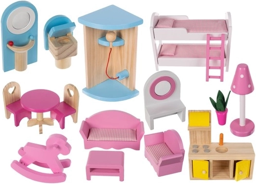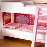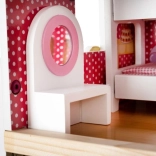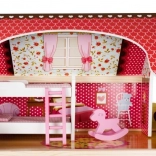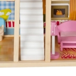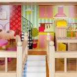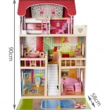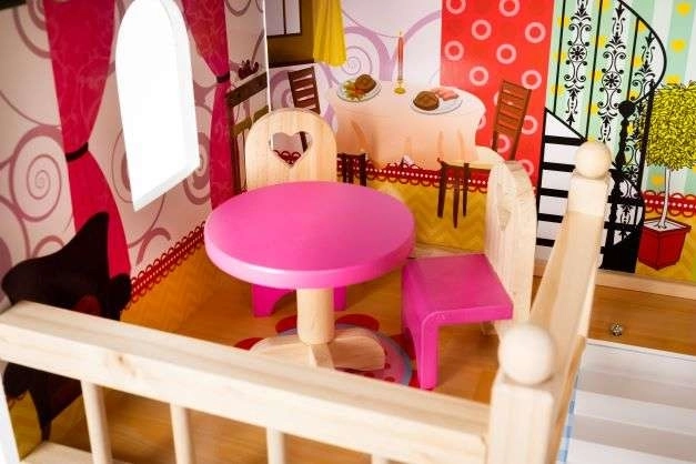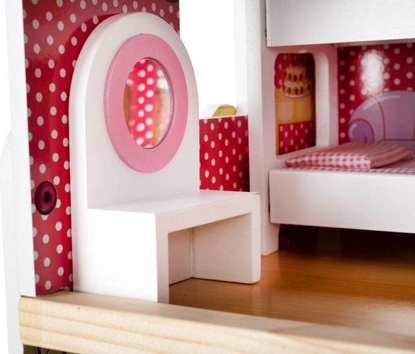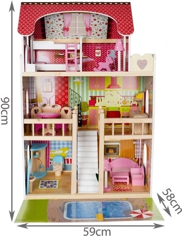 La maison de poupée en bois est un jouet formidable qui développe la créativité et les compétences sociales des enfants. Elle possède trois niveaux reliés par de magnifiques escaliers blancs et comprend au total cinq pièces, un balcon et un jardin avec piscine. Elle est équipée de divers éléments colorés et agréables qui garantissent un long amusement.