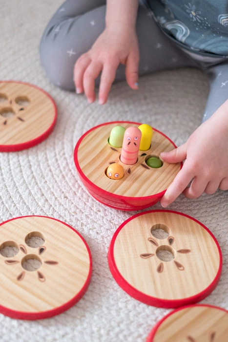Chaque niveau comporte un nombre différent de trous – les enfants empilent afin que cela corresponde au nombre de petits vers visibles. Une manière amusante de développer la pensée logique et la concentration.