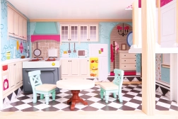 La maison propose une cuisine, un salon, une salle de bain et une chambre, le tout dans une finition colorée avec des accessoires réalistes pour un jeu immersif.