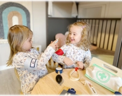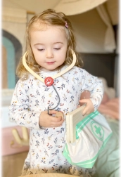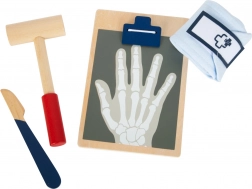 Inclus, un riche assortiment d’accessoires : stéthoscope, thermomètre à température réglable, seringue avec mécanisme mobile, otoscope avec véritable loupe, mais aussi tensiomètre avec brassard et poire, désinfectant avec pompe, flacons, cuillère, pince, scalpel, marteau réflexe et masques en textile. Les enfants peuvent soigner un « patient », apprendre les bases des soins et réduire la peur de rendre visite au médecin.