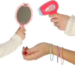 - Mallette, sèche-cheveux pour enfants, miroir, peigne, barrettes, bagues, bracelets, set d’autocollants, flacons colorés imitant vernis et parfums