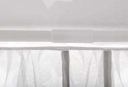 Six entrées avec voilages clairs et semi‑transparents peuvent être remontées et nouées avec des rubans. Les enfants bénéficient de suffisamment de lumière, d’air et d’un sentiment de sécurité.