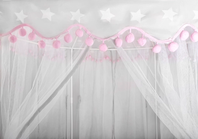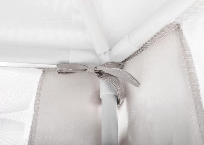 Le tapis spacieux et les parois aérées assurent le confort pour un ou plusieurs enfants – on y place aisément des coussins, peluches et livres. La tente convient parfaitement à l’intérieur comme au jardin sous la surveillance d’un adulte. Les pompons décoratifs et la possibilité de nouer les voilages apportent style au jeu et préservent l’intimité.