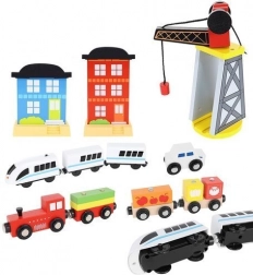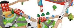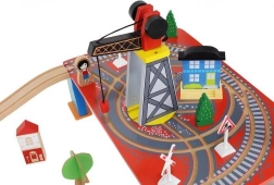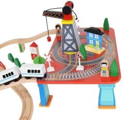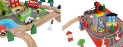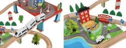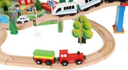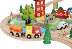 Circuit de train en bois comprenant au total 88 éléments fabriqués avec précision, dont des rails, un train de marchandises et un train de passagers, une voiture, des arbres et des panneaux de signalisation. Le plaisir réside dans la possibilité de créer son propre tracé, tandis que les connexions magnétiques entre les pièces assurent une utilisation facile.