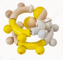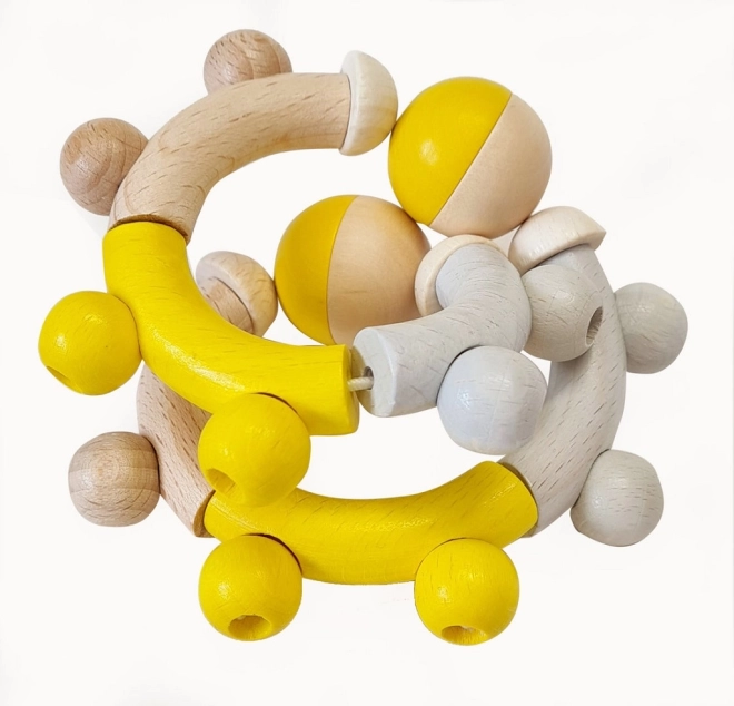 Hochet en bois Hess de couleur jaune, idéal pour le développement des compétences motrices de votre enfant. Fabriqué en bois de haute qualité, traité de manière écologique, il offre des possibilités créatives grâce à huit éléments montés sur un cordon élastique.